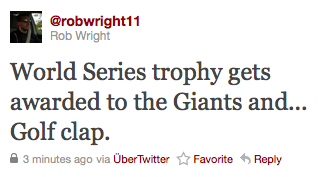 So that's it. The World Series is over, and it's taking baseball with it. The Giants are world champs, and while I was rooting for the Rangers, I can handle this result. I could tell you my thoughts on the matter, but I think it's more interesting to get the reactions of others, so here are some of the tweets that made the round last evening: